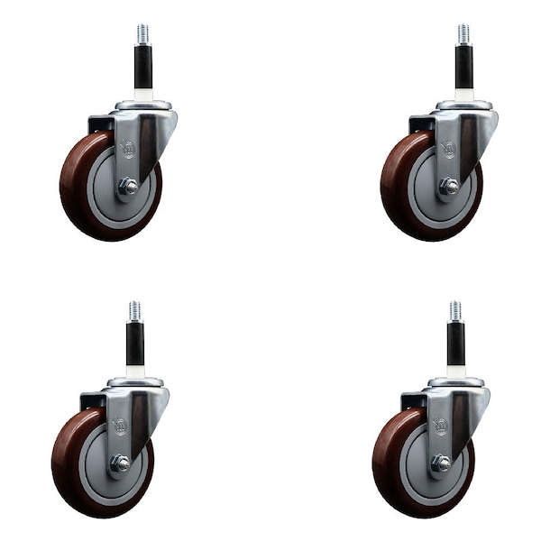 Listing is for a set of four 4 Service Caster Series #20 7/8'' expanding stem swivel casters with 4'' diameter by 1-1/4'' wide maroon polyurethane wheels capable of supporting a total weight of 1,400 lbs. 350 lbs./caster.. When searching for a reliable and durable solution to your caster needs, look no further than the Service Caster Series 20 expanding stem maroon polyurethane wheel casters. The Series #20 features an innovative expanding stem that can easily adapt to the inside diameter of the opening, allowing for a secure fit in round or square tubes. Simply tighten the topmost knurled nut to compress the rubber for a snug fit. For added security, further compress the rubber with a wrench via the nut under the swivel raceway. Finely crafted with a bright zinc plated finish, heat-treated ball bearing raceway, and a maroon polyurethane wheel, this versatile caster is ideal for work tables, shop projects, or any equipment with round or square tube legs. Service Caster is unsurpassed in quality, reliability, and excellent customer service. Count on us to move you forward.