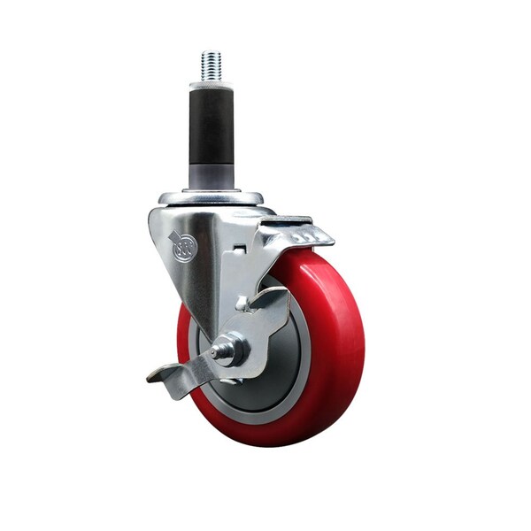 Listing is for one 1 Service Caster Series #20 1-1/8'' expanding stem swivel caster with a 4'' diameter by 1-1/4'' wide red polyurethane wheel and a top locking brake capable of supporting 350 lbs./caster. When searching for a reliable and durable solution to your caster needs, look no further than the Service Caster Series 20 expanding stem red polyurethane wheel casters. The Series #20 features an innovative expanding stem that can easily adapt to the inside diameter of the opening, allowing for a secure fit in round or square tubes. Simply tighten the topmost knurled nut to compress the rubber for a snug fit. For added security, further compress the rubber with a wrench via the nut under the swivel raceway. Finely crafted with a bright zinc plated finish, heat-treated ball bearing raceway, and a red polyurethane wheel, this versatile caster is ideal for work tables, shop projects, or any equipment with round or square tube legs. Service Caster is unsurpassed in quality, reliability, and excellent customer service. Count on us to move you forward.