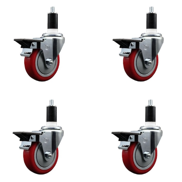 4'' Red Poly Swivel 1-3/8'' Expanding Stem Caster Set with Brake, 4PK