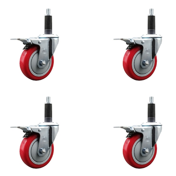 4'' Red Poly Swivel 1'' Expanding Stem Caster Set Total Lock Brake, 4PK