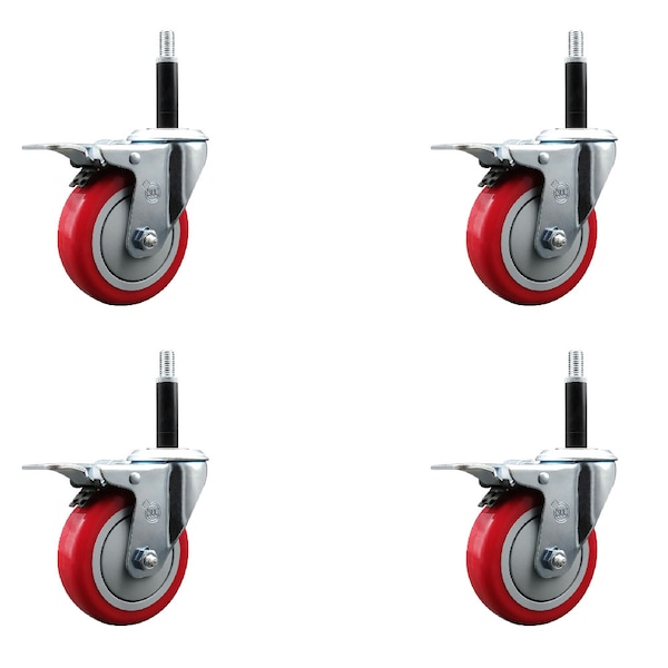4'' Red Poly Swivel 3/4'' Expanding Stem Caster Set Total Lock Brake, 4PK