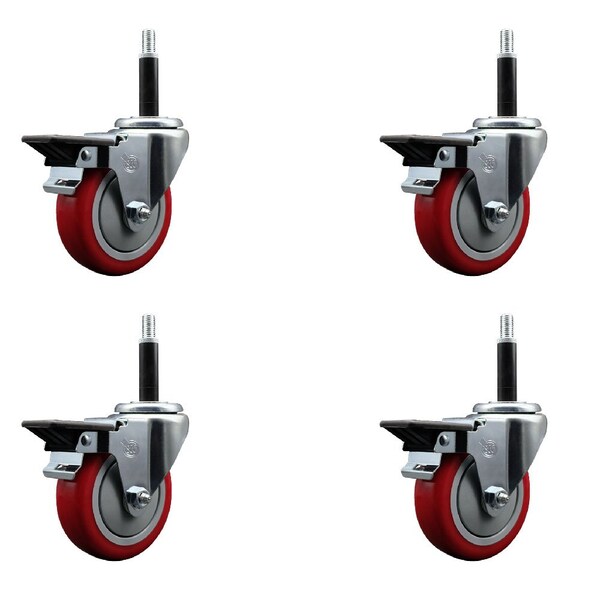 4'' Red Poly Swivel 3/4'' Expanding Stem Caster Set with Brake, 4PK