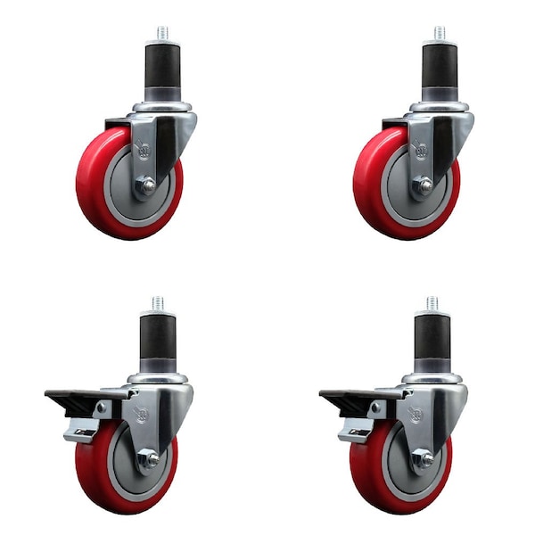 4'' Red Poly Wheel Swivel 1-5/8'' Expanding Stem Caster Set 2 Brakes, 4PK