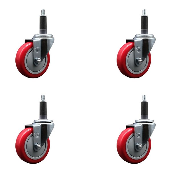 Listing is for a set of four 4 Service Caster Series #20 1'' expanding stem swivel casters with 4'' diameter by 1-1/4'' wide red polyurethane wheels capable of supporting a total weight of 1,400 lbs. 350 lbs./caster.. When searching for a reliable and durable solution to your caster needs, look no further than the Service Caster Series 20 expanding stem red polyurethane wheel casters. The Series #20 features an innovative expanding stem that can easily adapt to the inside diameter of the opening, allowing for a secure fit in round or square tubes. Simply tighten the topmost knurled nut to compress the rubber for a snug fit. For added security, further compress the rubber with a wrench via the nut under the swivel raceway. Finely crafted with a bright zinc plated finish, heat-treated ball bearing raceway, and a red polyurethane wheel, this versatile caster is ideal for work tables, shop projects, or any equipment with round or square tube legs. Service Caster is unsurpassed in quality, reliability, and excellent customer service. Count on us to move you forward.