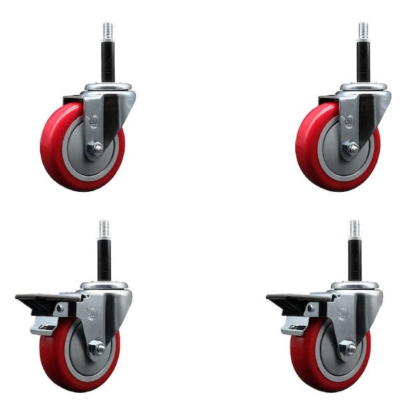 4'' Red Poly Wheel Swivel 3/4'' Expanding Stem Caster Set 2 Brakes, 4PK
