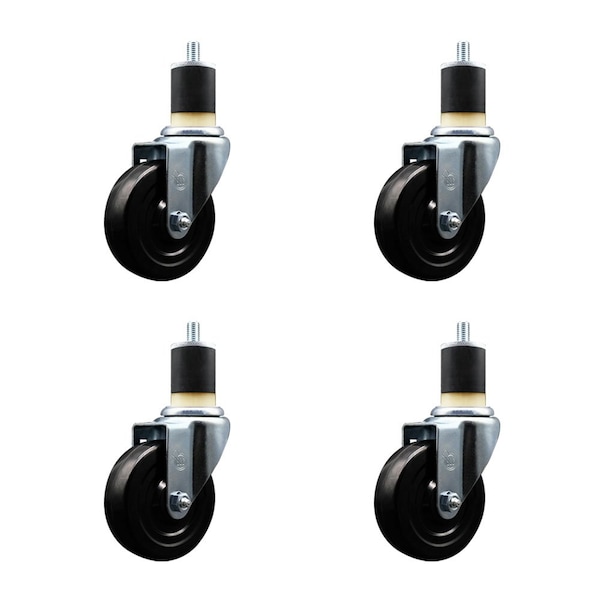 Listing is for a set of four 4 Service Caster Series #20 1-7/8'' expanding stem swivel casters with 4'' diameter by 1-1/4'' wide black soft rubber wheels capable of supporting a total weight of 800 lbs. 200 lbs./caster.. When searching for a reliable and durable solution to your caster needs, look no further than the Service Caster Series 20 expanding stem soft rubber wheel casters. The Series #20 features an innovative expanding stem that can easily adapt to the inside diameter of the opening, allowing for a secure fit in round or square tubes. Simply tighten the topmost knurled nut to compress the rubber for a snug fit. For added security, further compress the rubber with a wrench via the nut under the swivel raceway. Finely crafted with a bright zinc plated finish, heat-treated ball bearing raceway, and a soft rubber wheel, this versatile caster is ideal for work tables, shop projects, or any equipment with round or square tube legs. Service Caster is unsurpassed in quality, reliability, and excellent customer service. Count on us to move you forward.