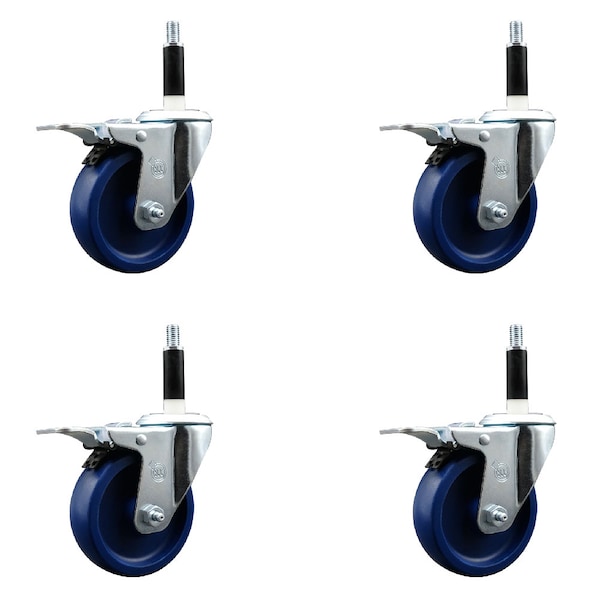 Listing is for a set of four 4 Service Caster Series #20 7/8'' expanding stem swivel casters with 4'' diameter by 1-1/4'' wide blue solid polyurethane wheels and total locking brakes capable of supporting a total weight of 1,200 lbs. 300 lbs./caster.. When searching for a reliable and durable solution to your caster needs, look no further than the Service Caster Series 20 expanding stem solid polyurethane wheel casters. The Series #20 features an innovative expanding stem that can easily adapt to the inside diameter of the opening, allowing for a secure fit in round or square tubes. Simply tighten the topmost knurled nut to compress the rubber for a snug fit. For added security, further compress the rubber with a wrench via the nut under the swivel raceway. Finely crafted with a bright zinc plated finish, heat-treated ball bearing raceway, and a solid polyurethane wheel, this versatile caster is ideal for work tables, shop projects, or any equipment with round or square tube legs. Service Caster is unsurpassed in quality, reliability, and excellent customer service. Count on us to move you forward.