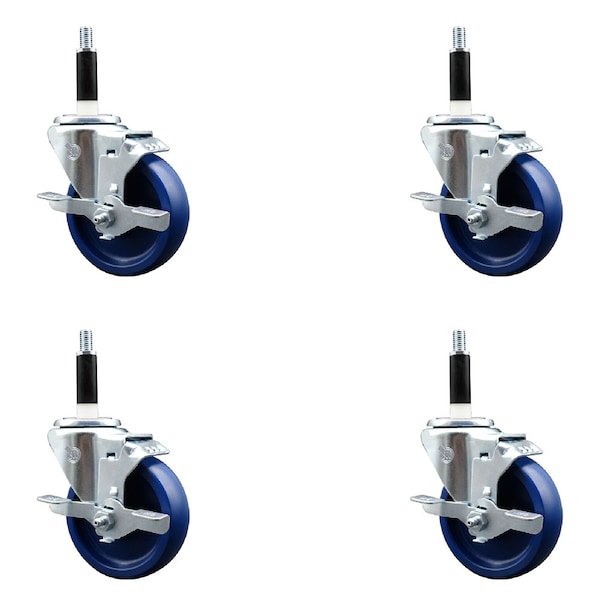 4'' SS Solid Poly Swivel 7/8'' Expanding Stem Caster Set with Brake, 4PK