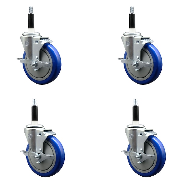 5'' Blue Poly Swivel 7/8'' Expanding Stem Caster Set with Brake, 4PK