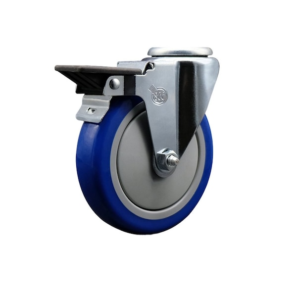 Listing is for one 1 Service Caster Series #20 swivel caster with a 5'' diameter by 1-1/4'' wide blue polyurethane wheel and a bolt hole with posi lock brake capable of supporting 350 lbs./caster. When searching for a reliable and durable solution to your caster needs, consider Service Caster's Series 20 bolt hole polyurethane casters. The Service Caster Series #20 is ideal for light and medium duty material handling, carts, equipment, and shop projects. The bolt hole can accept a bolt or a customized stem, allowing for any type of mounting requirement.The zinc plated finish provides durability under any condition, while the non-marking, non-marring polyurethane wheels perform especially well on hard surfaces such as concrete, tile, and wood. All rolling on a finely crafted ball bearing design that will keep you moving forward. Service Caster is unsurpassed in quality, reliability, and excellent customer service. Count on us to move you forward.