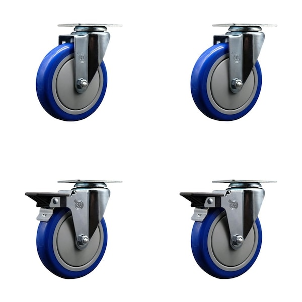 5'' Blue Poly Wheel Swivel Top Plate Caster Set with 2 Posi Brakes, 4PK