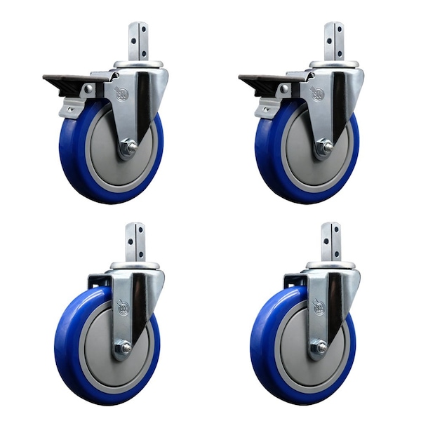 5'' Blue Polyurethane Wheel Swivel 7/8'' Square Stem Caster Set 2 Brakes, 4PK