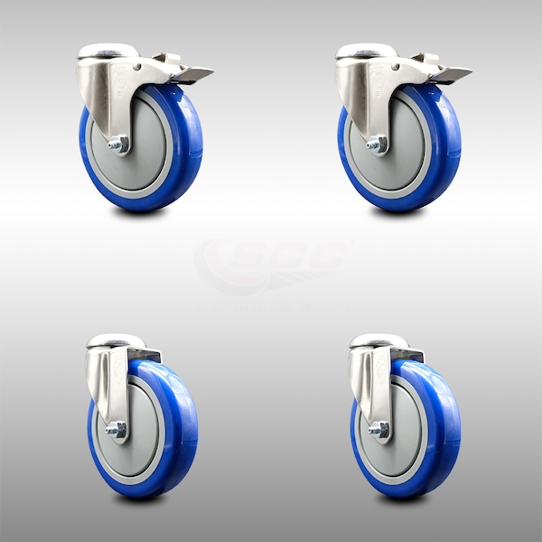 5 Inch 316SS Blue Polyurethane Swivel Bolt Hole Caster Set with 2 Lock Brake