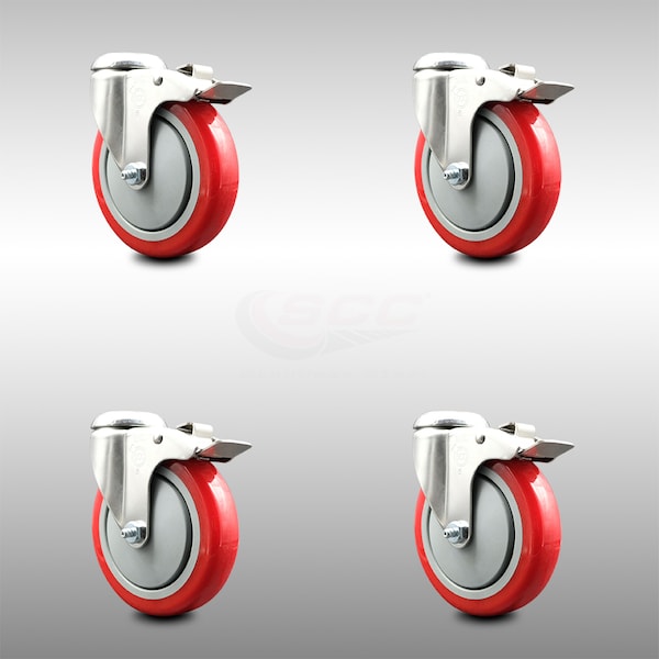 5 Inch 316SS Red Polyurethane Swivel Bolt Hole Caster Set with Lock Brake SCC