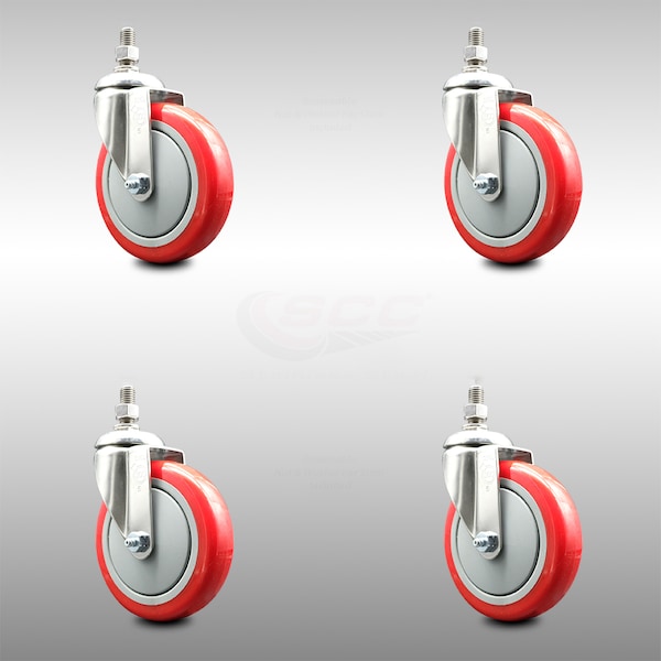 5 Inch 316SS Red Polyurethane Wheel Swivel 10mm Threaded Stem Caster Set