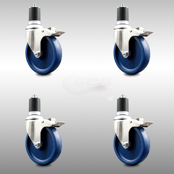 5 Inch 316SS Solid Poly Swivel 1-7/8 Inch Expanding Stem Caster Set Lock Brake