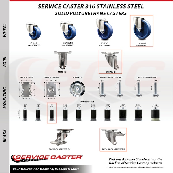 Listing is for one (1) Service Caster Series #20 1" expanding stem 316 stainless steel swivel caster with a 5" diameter by 1-1/4" wide solid polyurethane wheel and a total locking brake capable of supporting 300 lbs./caster. When searching for a reliable and durable solution to your caster needs, consider Service Caster's 316 stainless steel solid polyurethane wheel casters. Built with 316 stainless steel, which contains additional molybdenum and nickel content, makes this caster more corrosion resistant than standard 304 stainless steel. Molded as one solid piece, the non-marking, non-marring polyurethane wheel is free from debonding, and will not flatspot, as can occur with comparable polyurethane wheels, ensuring a smooth and solid roll over long periods of time. Mounting options include top plate, bolt hole, expanding stem and standard and metric threaded stem sizes. These versatile casters are ideal for a wide range of applications, such as dollies, platform trucks, warehouse carts and freight terminals. Or ensure a secure ride for food service carts, hotel housekeeping carts, and industrial and commercial equipment.