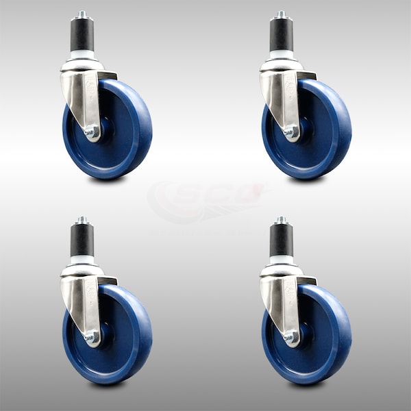 Listing is for a set of four (4) Service Caster Series #20 1-1/2" expanding stem 316 stainless steel swivel casters with 5" diameter by 1-1/4" wide solid polyurethane wheels capable of supporting a total weight of 1,200 lbs. (300 lbs./caster.). When searching for a reliable and durable solution to your caster needs, consider Service Caster's 316 stainless steel solid polyurethane wheel casters. Built with 316 stainless steel, which contains additional molybdenum and nickel content, makes this caster more corrosion resistant than standard 304 stainless steel. Molded as one solid piece, the non-marking, non-marring polyurethane wheel is free from debonding, and will not flatspot, as can occur with comparable polyurethane wheels, ensuring a smooth and solid roll over long periods of time. Mounting options include top plate, bolt hole, expanding stem and standard and metric threaded stem sizes. These versatile casters are ideal for a wide range of applications, such as dollies, platform trucks, warehouse carts and freight terminals. Or ensure a secure ride for food service carts, hotel housekeeping carts, and industrial and commercial equipment.