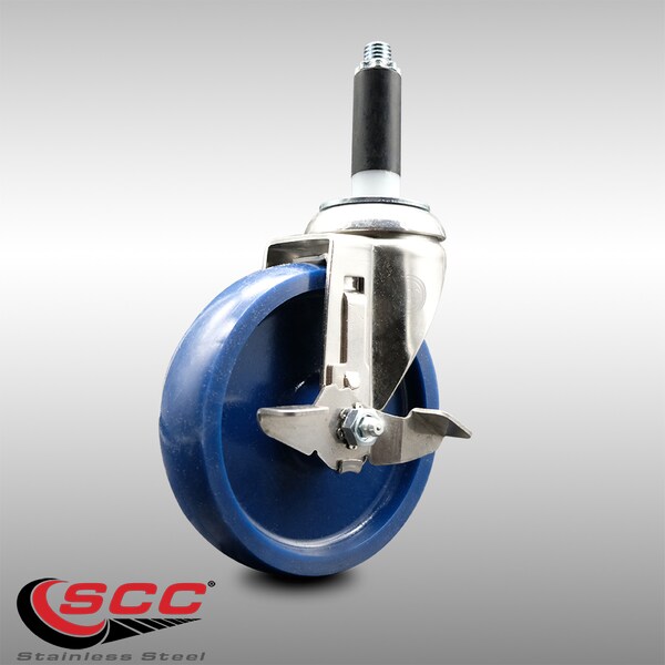 Listing is for one (1) Service Caster Series #20 7/8" expanding stem 316 stainless steel swivel caster with a 5" diameter by 1-1/4" wide solid polyurethane wheel and a top locking brake capable of supporting 300 lbs./caster. When searching for a reliable and durable solution to your caster needs, consider Service Caster's 316 stainless steel solid polyurethane wheel casters. Built with 316 stainless steel, which contains additional molybdenum and nickel content, makes this caster more corrosion resistant than standard 304 stainless steel. Molded as one solid piece, the non-marking, non-marring polyurethane wheel is free from debonding, and will not flatspot, as can occur with comparable polyurethane wheels, ensuring a smooth and solid roll over long periods of time. Mounting options include top plate, bolt hole, expanding stem and standard and metric threaded stem sizes. These versatile casters are ideal for a wide range of applications, such as dollies, platform trucks, warehouse carts and freight terminals. Or ensure a secure ride for food service carts, hotel housekeeping carts, and industrial and commercial equipment.