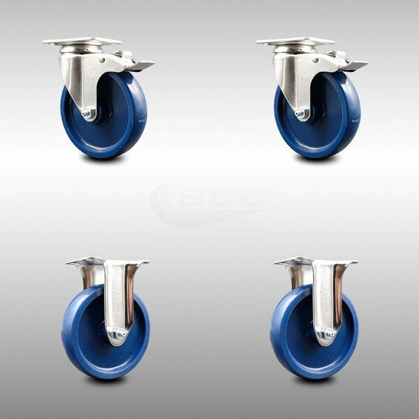 Listing is for a set of four (4) Service Caster Series #20 316 stainless steel casters, two (2) swivel total lock brake swivel casters and two (2) rigid casters, with 5” diameter by 1-1/4” wide blue solid polyurethane wheels. Supports a total weight of 1,200lbs (300lbs/per caster). When searching for a reliable and durable solution to your caster needs, consider Service Caster's 316 stainless steel solid polyurethane wheel casters. Built with 316 stainless steel, which contains additional molybdenum and nickel content, makes this caster more corrosion resistant than standard 304 stainless steel. Molded as one solid piece, the non-marking, non-marring polyurethane wheel is free from debonding, and will not flatspot, as can occur with comparable polyurethane wheels, ensuring a smooth and solid roll over long periods of time. Mounting options include top plate, bolt hole, expanding stem and standard and metric threaded stem sizes. These versatile casters are ideal for a wide range of applications, such as dollies, platform trucks, warehouse carts and freight terminals. Or ensure a secure ride for food service carts, hotel housekeeping carts, and industrial and commercial equipment.