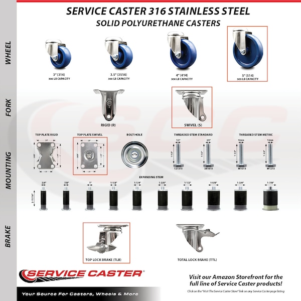 Listing is for one (1) Service Caster Series #20 316 stainless steel swivel caster with a 5" diameter by 1-1/4" wide blue solid polyurethane wheel and a top locking brake capable of supporting 300 lbs./caster. When searching for a reliable and durable solution to your caster needs, consider Service Caster's 316 stainless steel solid polyurethane wheel casters. Built with 316 stainless steel, which contains additional molybdenum and nickel content, makes this caster more corrosion resistant than standard 304 stainless steel. Molded as one solid piece, the non-marking, non-marring polyurethane wheel is free from debonding, and will not flatspot, as can occur with comparable polyurethane wheels, ensuring a smooth and solid roll over long periods of time. Mounting options include top plate, bolt hole, expanding stem and standard and metric threaded stem sizes. These versatile casters are ideal for a wide range of applications, such as dollies, platform trucks, warehouse carts and freight terminals. Or ensure a secure ride for food service carts, hotel housekeeping carts, and industrial and commercial equipment.