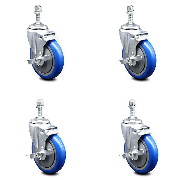 5 Inch Blue Polyurethane Swivel 10mm Threaded Stem Caster Set with Brake