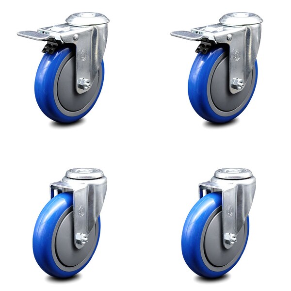 5 Inch Blue Polyurethane Swivel Bolt Hole Caster Set with 2 Total Lock Brake