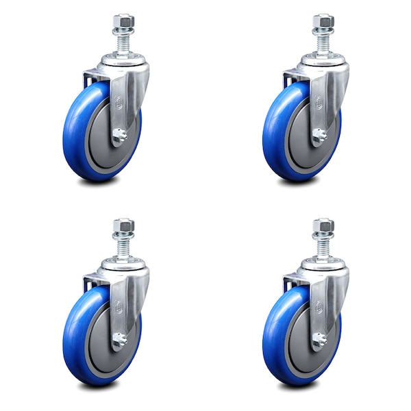 5 Inch Blue Polyurethane Wheel Swivel 1/2 Inch Threaded Stem Caster Set SCC