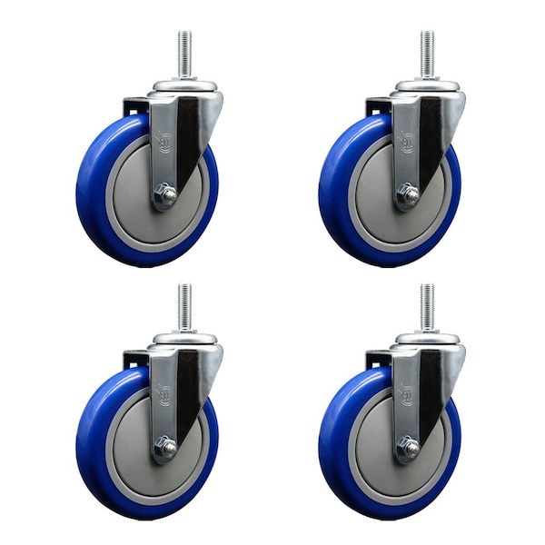 5 Inch Blue Polyurethane Wheel Swivel 34 Inch Threaded Stem Caster Set Service Caster