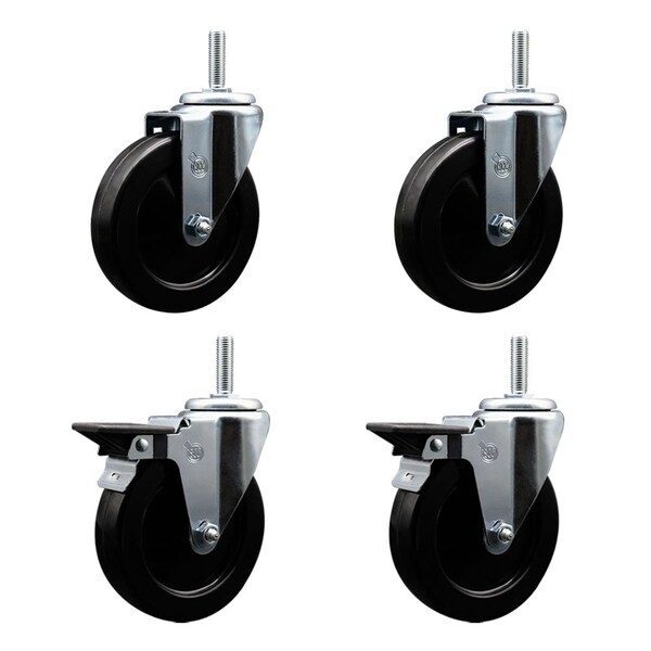 5 Inch Hard Rubber Wheel Swivel 34 Inch Threaded Stem Caster Set 2 Brakes SCC