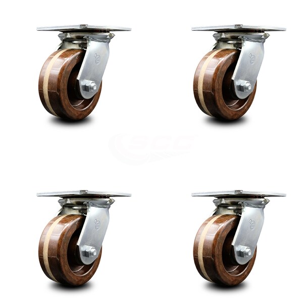 5 Inch Heavy Duty High Temp Phenolic Caster Set with Roller Bearings, 4PK