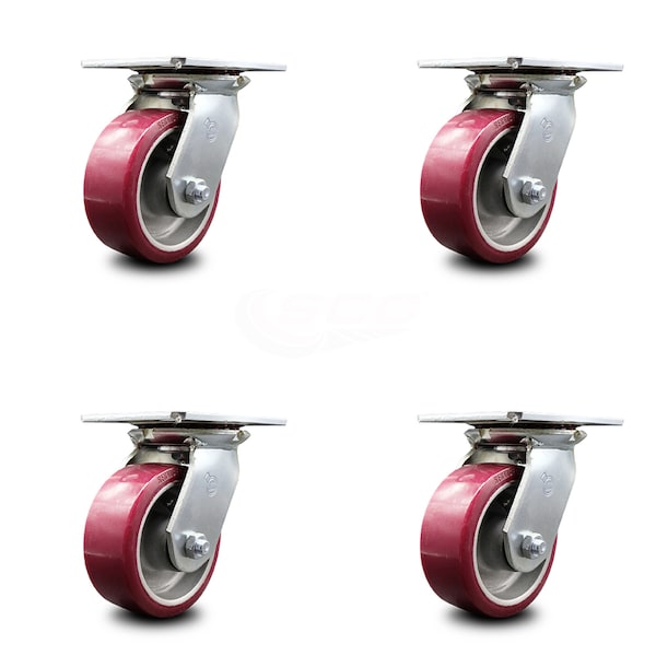 Listing is for a set of four (4) Service Caster Series #35 swivel casters with 5" diameter by 2" wide polyurethane on aluminum wheels capable of supporting a total weight of 3,600 lbs. (900 lbs. per caster). When searching for a reliable and durable solution to your caster needs, rely on Service Caster Series 35 polyurethane aluminum wheel casters. The Series #35 features heavy duty polyurethane wheels that are chemically bonded to an aluminum core, providing a smooth roll over uneven surfaces without marking or marring floors. Finely crafted with a bright zinc plated finish and heat-treated ball bearing raceway, these versatile casters are ideal for a wide range of applications. Use on dollies, platform trucks, warehouse carts and freight terminals, or ensure a smooth and secure ride for food service carts, hotel housekeeping carts, and industrial and commercial equipment. Even drywall carts, welding carts, and wall panel carts will be ready to roll on the Series 35, keeping you moving forward.