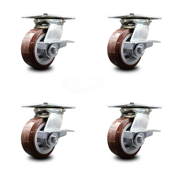 5 Inch Heavy Duty Polyurethane Caster Set with Roller Bearings and Brakes SCC
