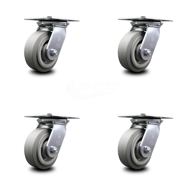Listing is for a set of four (4) Service Caster Series #35 swivel casters with 5" diameter by 2" wide thermoplastic rubber flat tread wheels capable of supporting a total weight of 1,400 lbs. (350 lbs. per caster). When searching for a reliable and durable solution for medium and heavy duty projects, consider Service Caster’s Series 35 thermoplastic rubber flat tread on polyolefin core casters. The soft flat tread is made of thermoplastic rubber that is non-marking and non-marring, and on the polyolefin core provides a long lasting, high capacity wheel that is capable of easy rolling under heavy loads. Finely crafted with double ball bearing heat treated raceways, these versatile casters are ideal for a wide range of applications, such as dollies, platform trucks, warehouse carts and freight terminals. Or ensure a smooth and secure ride for food service carts, hotel housekeeping carts, and industrial and commercial equipment. Even drywall carts, welding carts, and wall panel carts will be ready to roll on the Series 35, keeping you moving forward.