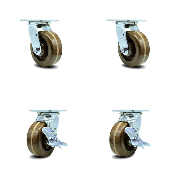 5 Inch High Temp Phenolic Swivel Caster Set with Roller Bearings 2 Brakes SCC
