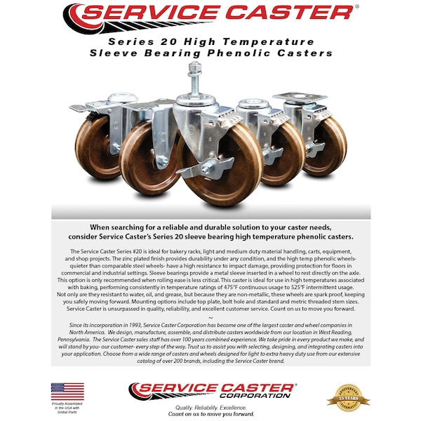 Listing is for a set of four (4) Service Caster Series #20 swivel casters, four (4) swivel 10mm threaded stem casters with 5” diameter by 1-1/4” wide high temperature phenolic wheels. Supports a total weight of 1,200lbs (300lbs/per caster). When searching for a reliable and durable solution to your caster needs, consider Service Caster’s Series 20 sleeve bearing high temperature phenolic casters. The Service Caster Series #20 is ideal for bakery racks, light and medium duty material handling, carts, equipment, and shop projects. The zinc plated finish provides durability under any condition, and the high temp phenolic wheels- quieter than comparable steel wheels- have a high resistance to impact damage, providing protection for floors in commercial and industrial settings. Sleeve bearings provide a metal sleeve inserted in a wheel to rest directly on the axle. This option is only recommended when rolling ease is less critical. This caster is ideal for use in high temperatures associated with baking, performing consistently in temperature ratings of 475°F continuous usage to 525°F intermittent usage. Not only are they resistant to water, oil, and grease, but because they are non-metallic, these wheels are spark proof, keeping you safely moving forward. Mounting options include top plate, bolt hole and standard and metric threaded stem sizes. Service Caster is unsurpassed in quality, reliability, and excellent customer service. Count on us to move you forward.