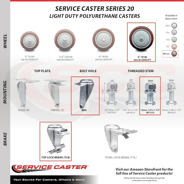 Listing is for a set of four (4) Service Caster Series #20 swivel casters, four (4) swivel 12mm threaded stem casters with top lock brakes, 5” diameter by 1-1/4” wide maroon polyurethane wheels. Supports a total weight of 1,200lbs (300lbs/per caster). When searching for a reliable and durable solution to your caster needs, consider Service Caster’s Series 20 threaded stem polyurethane casters. The Service Caster Series #20 is ideal for light and medium duty material handling, carts, equipment, and shop projects. The bolt hole can accept a bolt or a customized stem, allowing for any type of mounting requirement. The zinc plated finish provides durability under any condition, while the non-marking, non-marring polyurethane wheels perform especially well on hard surfaces such as concrete, tile, and wood. All rolling on a finely crafted ball bearing design that will keep you moving forward. Service Caster is unsurpassed in quality, reliability, and excellent customer service. Count on us to move you forward.