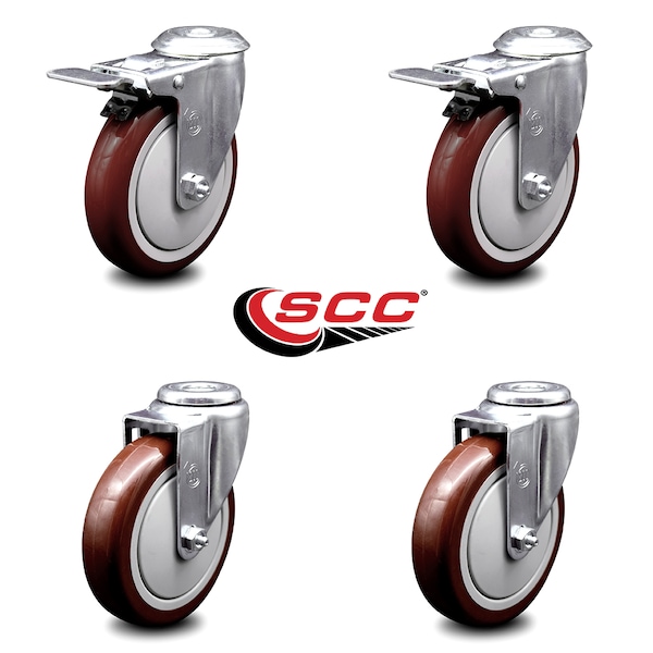 5 Inch Maroon Polyurethane Swivel Bolt Hole Caster Set with 2 Total Lock Brake