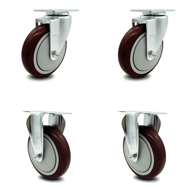5 Inch Maroon Polyurethane Wheel Swivel Top Plate Caster Set with 2 Rigid SCC