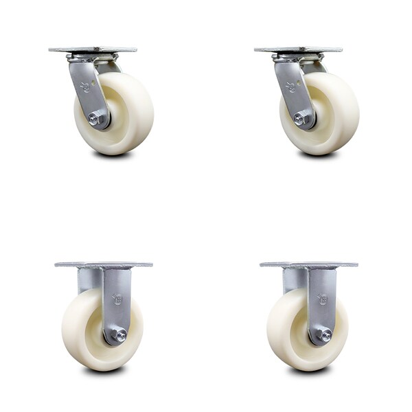Listing is for a set of four (4) Service Caster Series #30 casters, two (2) swivel and two (2) rigid casters, with 5" diameter by 2" wide nylon wheels capable of supporting a total weight of 3,600 lbs. (900 lbs./caster).When searching for a reliable and durable heavy duty solution to your caster needs, consider Service Caster’s Series 30 nylon wheel casters.The Service Caster Series #30 is ideal for medium and heavy duty material handling, carts, equipment, and shop projects. The zinc plated finish provides durability under any condition and the nylon wheels provide very low rolling resistance, show a high resistance to many aggressive substances and under normal operating conditions are maintenance free. Resistant to most chemical and oils, these nylon wheels will keep you safely moving forward. Service Caster is unsurpassed in quality, reliability, and excellent customer service. Count on us to move you forward.