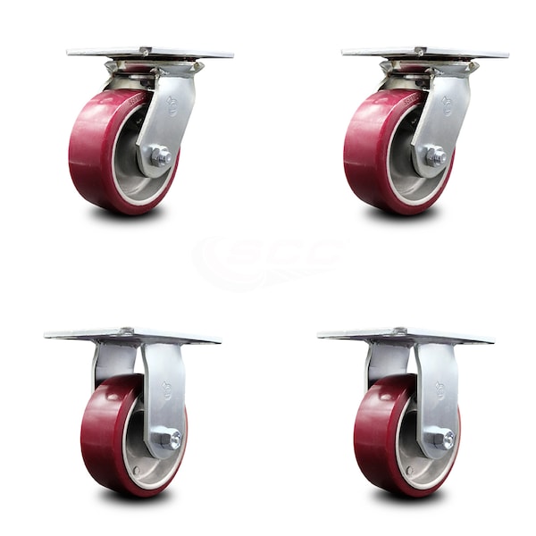 Listing is for a set of four (4) Service Caster Series #35 casters, two (2) swivel and two (2) rigid casters, with 5" diameter by 2" wide polyurethane on aluminum wheels capable of supporting a total weight of 3,600 lbs. (900 lbs./caster). When searching for a reliable and durable solution to your caster needs, rely on Service Caster Series 35 polyurethane aluminum wheel casters. The Series #35 features heavy duty polyurethane wheels that are chemically bonded to an aluminum core, providing a smooth roll over uneven surfaces without marking or marring floors. Finely crafted with a bright zinc plated finish and heat-treated ball bearing raceway, these versatile casters are ideal for a wide range of applications. Use on dollies, platform trucks, warehouse carts and freight terminals, or ensure a smooth and secure ride for food service carts, hotel housekeeping carts, and industrial and commercial equipment. Even drywall carts, welding carts, and wall panel carts will be ready to roll on the Series 35, keeping you moving forward.