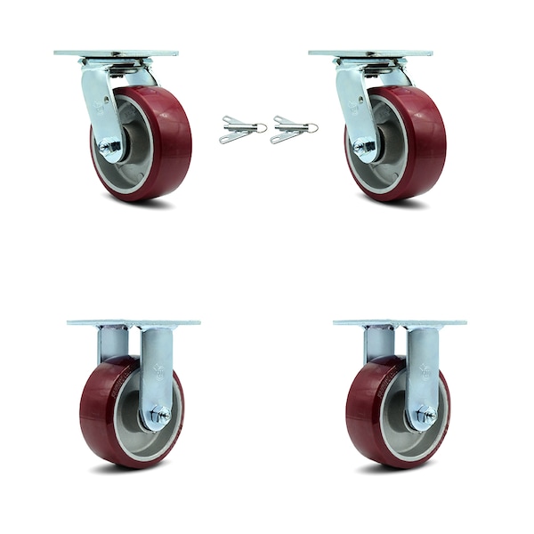Listing is for a set of four (4) Service Caster Series #30 casters, two (2) swivel casters with bolt on swivel locks and two (2) rigid casters, with 5" diameter by 2" wide polyurethane on aluminum wheels capable of supporting a total weight of 3,600 lbs. (900 lbs./caster).When searching for a reliable and durable solution to your caster needs, rely on Service Caster Series 30 polyurethane aluminum wheel casters. The Series #30 features heavy duty polyurethane wheels that are chemically bonded to an aluminum core, providing a smooth roll over uneven surfaces without marking or marring floors. Finely crafted with a bright zinc plated finish and heat-treated ball bearing raceway, these versatile casters are ideal for a wide range of applications. Use on dollies, platform trucks, warehouse carts and freight terminals, or ensure a smooth and secure ride for food service carts, hotel housekeeping carts, and industrial and commercial equipment. Even drywall carts, welding carts, and wall panel carts will be ready to roll on the Series 30, keeping you moving forward. Service Caster is unsurpassed in quality, reliability, and excellent customer service. Count on us to move you forward.