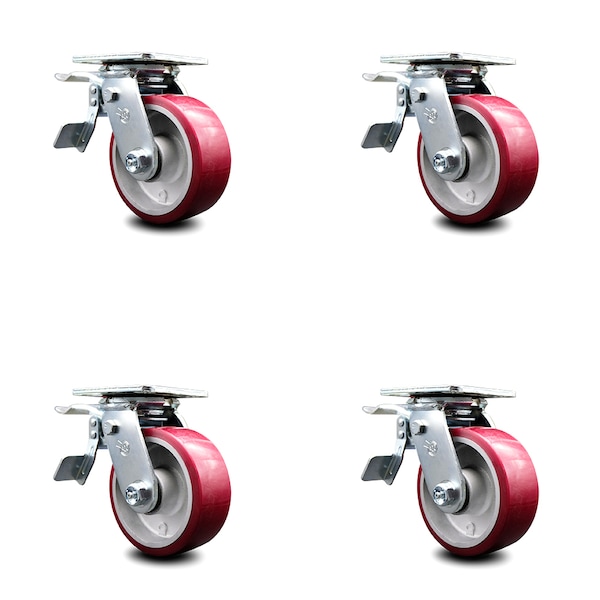 Listing is for a set of four (4) Service Caster Series #30 swivel casters with 5" diameter by 2" wide polyurethane on aluminum wheels with total lock brakes capable of supporting a total weight of 3,600 lbs. (900 lbs. per caster). When searching for a reliable and durable solution to your caster needs, rely on Service Caster Series 30 polyurethane aluminum wheel casters. The Series #30 features heavy duty polyurethane wheels that are chemically bonded to an aluminum core, providing a smooth roll over uneven surfaces without marking or marring floors. Finely crafted with a bright zinc plated finish and heat-treated ball bearing raceway, these versatile casters are ideal for a wide range of applications. Use on dollies, platform trucks, warehouse carts and freight terminals, or ensure a smooth and secure ride for food service carts, hotel housekeeping carts, and industrial and commercial equipment. Even drywall carts, welding carts, and wall panel carts will be ready to roll on the Series 30, keeping you moving forward. Service Caster is unsurpassed in quality, reliability, and excellent customer service. Count on us to move you forward.