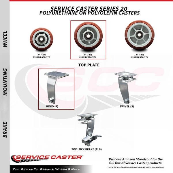 Listing is for a set of four (4) Service Caster Series #20 casters, two (2) swivel and two (2) rigid casters, with 5" diameter by 2" wide polyurethane on polyolefin wheel and roller bearings capable of supporting a total weight of 1,800 lbs. (450 lbs./caster). When searching for a reliable and durable solution to your caster needs, consider Service Caster Series 20 polyurethane wheel casters. The Service Caster Series #20 features heavy duty non-marking polyurethane tread on a polyolefin core wheel, providing a smooth roll over uneven surfaces without marking or marring floors. These versatile casters are ideal for a wide range of applications, such as dollies, platform trucks, warehouse carts and freight terminals. Or ensure a smooth and secure ride for food service carts, hotel housekeeping carts, and industrial and commercial equipment. Even drywall carts, welding carts, and wall panel carts will be ready to roll on the Series 20, keeping you moving forward. Service Caster is unsurpassed in quality, reliability, and excellent customer service. Count on us to move you forward.