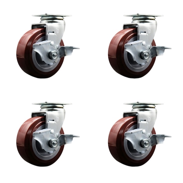 Listing is for a set of four (4) Service Caster Series #20 swivel casters, four (4) swivel casters with top lock brakes, 5” diameter by 2" wide polyurethane on polyolefin wheel and roller bearings. Supports a total weight of 1,800lbs (450lbs/per caster). When searching for a reliable and durable solution to your caster needs, consider Service Caster Series 20 polyurethane wheel casters. The Service Caster Series #20 features heavy duty non-marking polyurethane tread on a polyolefin core wheel, providing a smooth roll over uneven surfaces without marking or marring floors. These versatile casters are ideal for a wide range of applications, such as dollies, platform trucks, warehouse carts and freight terminals. Or ensure a smooth and secure ride for food service carts, hotel housekeeping carts, and industrial and commercial equipment. Even drywall carts, welding carts, and wall panel carts will be ready to roll on the Series 20, keeping you moving forward. Service Caster is unsurpassed in quality, reliability, and excellent customer service. Count on us to move you forward.