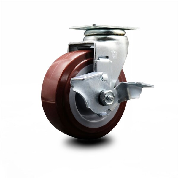 Listing is for one (1) Service Caster Series #20 swivel caster with a 5" diameter by 2" wide polyurethane on polyolefin wheel and roller bearing and a top locking brake capable of supporting 450 lbs./caster. When searching for a reliable and durable solution to your caster needs, consider Service Caster Series 20 polyurethane wheel casters. The Service Caster Series #20 features heavy duty non-marking polyurethane tread on a polyolefin core wheel, providing a smooth roll over uneven surfaces without marking or marring floors. These versatile casters are ideal for a wide range of applications, such as dollies, platform trucks, warehouse carts and freight terminals. Or ensure a smooth and secure ride for food service carts, hotel housekeeping carts, and industrial and commercial equipment. Even drywall carts, welding carts, and wall panel carts will be ready to roll on the Series 20, keeping you moving forward. Service Caster is unsurpassed in quality, reliability, and excellent customer service. Count on us to move you forward.