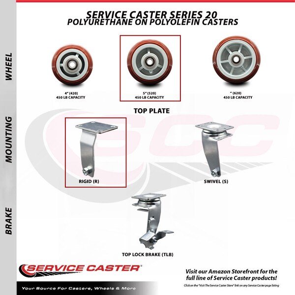 Listing is for one (1) Service Caster Series #20 rigid caster with a 5" diameter by 2" wide polyurethane on polyolefin wheel and maintenance free precision ball wheel bearing capable of supporting 450lbs./caster. When searching for a reliable and durable solution to your caster needs, consider Service Caster Series 20 polyurethane wheel casters. The Service Caster Series #20 features heavy duty non-marking polyurethane tread on a polyolefin core wheel, providing a smooth roll over uneven surfaces without marking or marring floors. These versatile casters are ideal for a wide range of applications, such as dollies, platform trucks, warehouse carts and freight terminals. Or ensure a smooth and secure ride for food service carts, hotel housekeeping carts, and industrial and commercial equipment. Even drywall carts, welding carts, and wall panel carts will be ready to roll on the Series 20, keeping you moving forward. Service Caster is unsurpassed in quality, reliability, and excellent customer service. Count on us to move you forward.