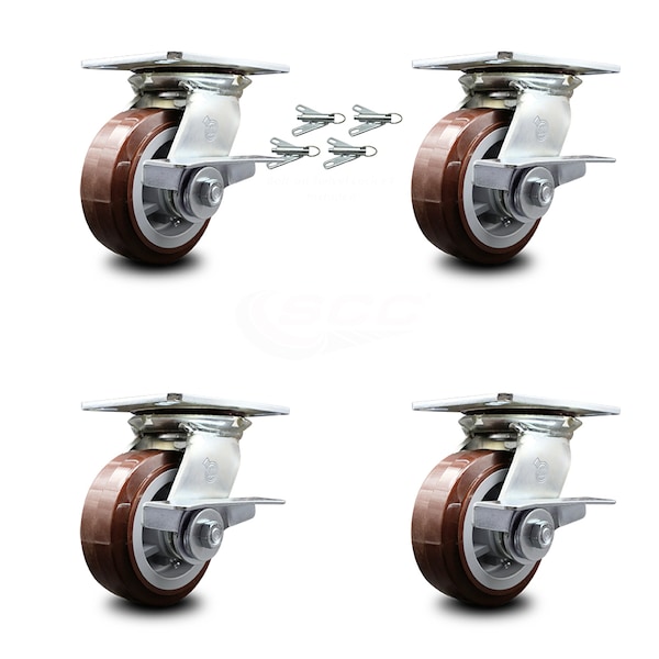 5 Inch Polyurethane Caster Set with Roller Bearing and Brakes/Swivel Locks SCC