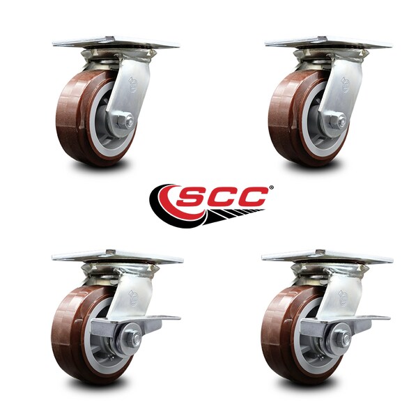 5 Inch Polyurethane Swivel Caster Set with Roller Bearings 2 Brakes SCC