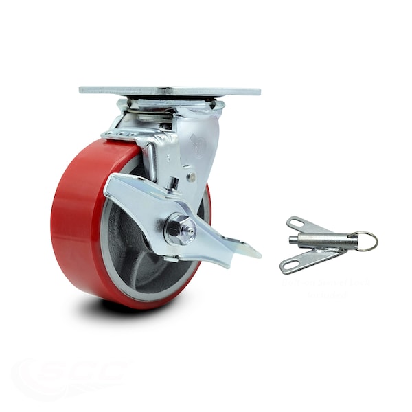 Listing is for one (1) Service Caster Series #30 swivel caster with a 5" diameter by 2" wide red polyurethane on cast iron wheel with a side lock brake & bolt on swivel lock capable of supporting 1,000 lbs./caster.When searching for a reliable and durable solution for medium and heavy duty projects, consider Service Caster’s Series 30 polyurethane on metal wheel casters. The Service Caster Series #30 is ideal for material handling, carts, equipment, and shop projects. The non-marking, non-marring polyurethane tread performs especially well on hard surfaces such as concrete, tile, and wood, while the metal core wheel stands up to heavier loads with a stable and secure roll. Finely crafted with double ball bearing heat treated raceways, these versatile casters are ideal for a wide range of applications, such as dollies, platform trucks, warehouse carts and freight terminals. Or ensure a smooth and secure ride for food service carts, hotel housekeeping carts and industrial and commercial equipment. Even drywall carts, welding carts, and wall panel carts will be ready to roll on the Series 30, keeping you moving forward. Service Caster is unsurpassed in quality, reliability, and excellent customer service. Count on us to move you forward.